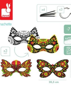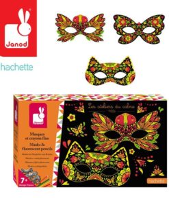 Zestaw kreatywny do tworzenia fluorescencyjnych masek francuskiej marki JANOD zawiera 3 maski z solidnego kartonu – motyla, sowy i kota. Maski mają czarne kontury i wiele drobnych miejsc do pokolorowania dołączonymi do zestawu kredkami w odblaskowych kolorach: różowym, pomarańczowym, żółtym i zielonym. W komplecie znajdują się ponadto 3 gumki do przewiązania przez boczne otwory masek, dzięki którym gotowe, bajecznie kolorowe ozdoby można nosić jako przebranie. Kolorowanie to dla dziecka długie godziny angażującej i jednocześnie uspokajającej, wyciszającej zabawy, a gotowe dzieła zapewnią emocjonującą rozrywkę dla kilkorga dzieci, a nawet dla dorosłych.