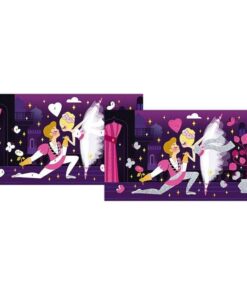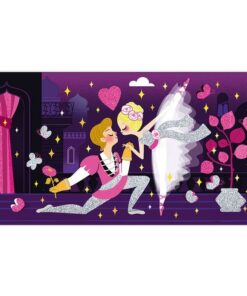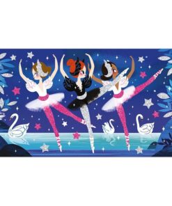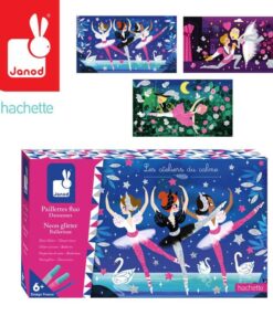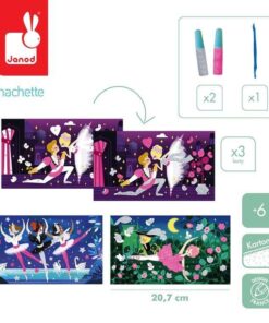 Zestaw kreatywny Magiczny brokat Jezioro Łabędzie francuskiej marki JANOD zawiera 3 plansze – obrazki z baletnicami w trakcie scenicznych występów. Obrazki posiadają powłokę samoprzylepną, dzięki czemu, po odklejeniu warstwy zabezpieczającej – w wyznaczonych miejscach – ilustracje można posypać dołączonym do zestawu brokatem w 2 neonowych kolorach: srebrnym i różowym. Brokat przykleja się do obrazków, pozostawiając na nich drobną lśniącą strukturę. W komplecie znajduje się też szpatułka pomocna przy odklejaniu powierzchni, przeznaczonych do ozdabiania. Przyklejanie drobinek brokatu to dla dziecka długie godziny angażującej i jednocześnie uspokajającej, wyciszającej zabawy, a gotowe obrazki będą wspaniałym elementem dekoracyjnym dziecięcego pokoju.