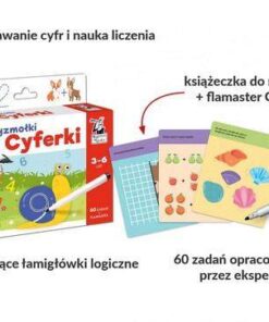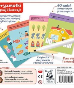 W pakiecie znajduje się 60 zadań z flamastrem, dzięki któremu możliwe jest wielokrotne rozwiązywanie zagadek i zmazywanie odpowiedzi, co ułatwi wspólną zabawę z rodzeństwem i rówieśnikami. Dodatkowym atutem są barwne ilustracje zadań autorstwa Ewy Brzozowskiej, które przyciągną uwagę dziecka i zachęcą do zaangażowania.
