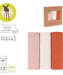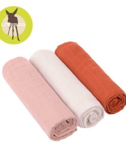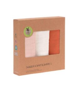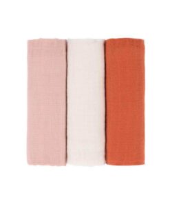 Komplet trzech wielofunkcyjnych otulaczy z wegańskiej bawełny niemieckiej marki LASSIG: jeden rdzawy, drugi mlecznobiały oraz trzeci – w pudrowym odcieniu różu. Mogą być używane do owijania maluszka, jako pieluszka do odbijania po karmieniu, kocyk na lato, prześcieradło czy kocyk do wózka, chusta do karmienia piersią, ochrona przed słońcem i na wszelkie inne sposoby według potrzeb. Są jednowarstwowe, lekkie, przewiewne, oddychające i delikatne dla skóry. Zapewniają doskonałą wentylację i komfort. Dzięki kompletowi 3 sztuk w rozmiarze 85 na 85 cm rodzic ma potrzebny otulacz zawsze pod ręką.