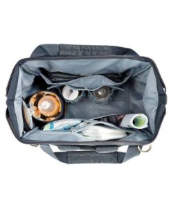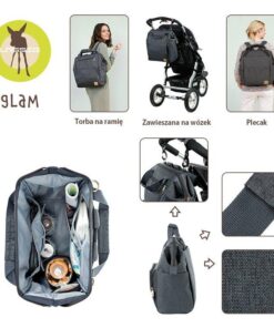- liczne kieszenie wewnętrzne, pozwalające dobrze zorganizować przestrzeń, w tym: większa wodoodporna zapinana na suwak (na mokre ubranka czy pieluszkę), dwie mniejsze otwarte, większa zapinana na rzep – przeznaczona na przewijak oraz dwie mniejsze wykończone gumką – doskonałe na słoiczki z obiadkiem czy napój, przyczepione zatrzaskami, które w razie potrzeby można odpiąć; wewnątrz idealne miejsce na chusteczki czy zapas śliniaków;