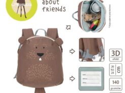 Wyjątkowo uroczy plecaczek 3D w kształcie bobra niemieckiej marki LASSIG. Funkcjonalny, lekki i wygodny, idealny dla maluchów już od 2. roku życia, do przedszkola i na krótkie wycieczki. Bóbr ma piękny brązowy kolor, uszka, malowany pyszczek i futerko oraz długi ogon. Dość przestronna komora główna zapinana jest na suwak, posiada wewnętrzną kieszeń na butelkę z napojem oraz etykietkę z wizytówką, na której można zapisać imię dziecka i numer kontaktowy rodzica. Plecak uszyto z wysokiej jakości, trwałych materiałów, tylna ścianka jest lekko wzmocniona, ale nadal miękka w kontakcie z plecami dziecka. W górnej części znajduje się uszko do zawieszenia plecaka, np. na haczyku w szatni. Dość szerokie, grubsze i miękkie ramiączka zapewniają wygodę noszenia. Z przodu, na klatce piersiowej dodatkowo wyposażone są z w stabilizujące i odciążające plecy zapięcie na zatrzask – jego wysokość, podobnie jak długość ramiączek, można regulować i na bieżąco dopasowywać do wzrostu dziecka. Uszko, paski oraz ułatwiające dziecku samodzielne zapinanie sznureczki przy suwakach mają kolor bladoniebieski. Materiał plecaka łatwo się czyści i jest odporny na wilgoć.