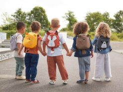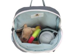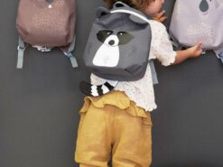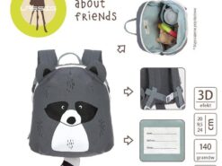 Wyjątkowo uroczy plecaczek 3D w kształcie szopa niemieckiej marki LASSIG. Funkcjonalny, lekki i wygodny, idealny dla maluchów już od 2. roku życia, do przedszkola i na krótkie wycieczki. Szop ma piękny ciemnoszary kolor, spore uszka, malowany pyszczek i futerko oraz długi ogon w biało-czarne pasy. Dość przestronna komora główna zapinana jest na suwak, posiada wewnętrzną kieszeń na butelkę z napojem oraz etykietkę z wizytówką, na której można zapisać imię dziecka i numer kontaktowy rodzica. Plecak uszyto z wysokiej jakości, trwałych materiałów, tylna ścianka jest lekko wzmocniona, ale nadal miękka w kontakcie z plecami dziecka. W górnej części znajduje się uszko do zawieszenia plecaka, np. na haczyku w szatni. Dość szerokie, grubsze i miękkie ramiączka zapewniają wygodę noszenia. Z przodu, na klatce piersiowej dodatkowo wyposażone są z w stabilizujące i odciążające plecy zapięcie na zatrzask – jego wysokość, podobnie jak długość ramiączek, można regulować i na bieżąco dopasowywać do wzrostu dziecka. Uszko, paski oraz ułatwiające dziecku samodzielne zapinanie sznureczki przy suwakach mają kolor bladoniebieski. Materiał plecaka łatwo się czyści i jest odporny na wilgoć.