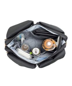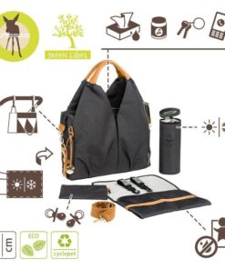 - wiele kieszeni wewnętrznych, w tym: duża, zapinana na zamek i wodoodporna, w której bezpiecznie ulokujesz poplamioną koszulkę czy śliniak i mniejsza na rzep – na ubranko na zmianę lub ukochany kocyk; dwie mniejsze przegródki wykończone gumką – doskonałe na słoiki z deserem lub obiadem – dodatkowo usztywnione i wyjmowane, bo przypięte do wewnątrz na zatrzaski; otwarta kieszonka na dołączoną do torby, poręczną, składaną matę do przewijania, w kolorze torby; oraz kieszeń z „okienkiem”, idealna na wilgotne chusteczki, bo umożliwia wyjmowanie ich bez wyciągania całego opakowania;