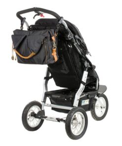 - solidne wykończenia z karmelowej skóry i metalu: paski, rączki, metki, uchwyty do wózka i dodatkowego paska, rzemyk z medalionem z logo marki;