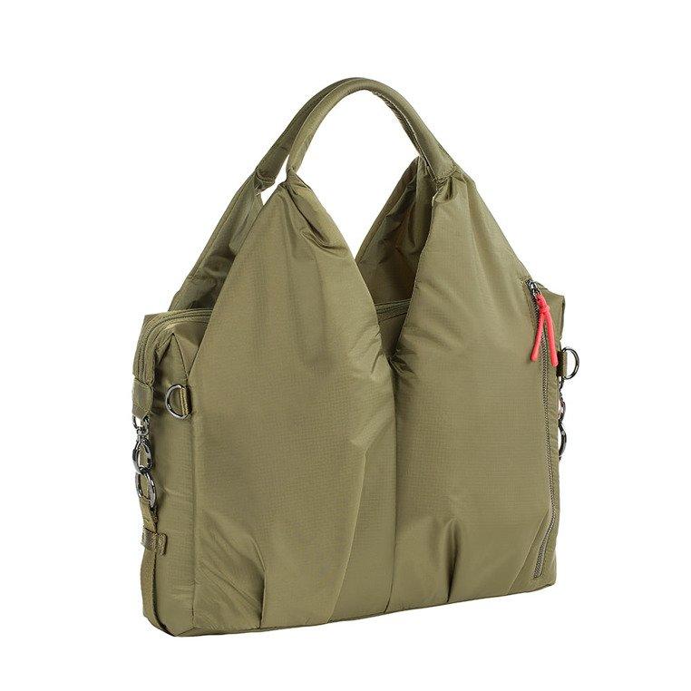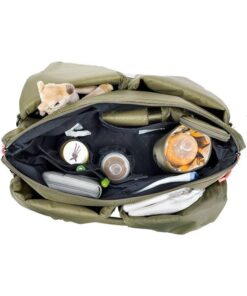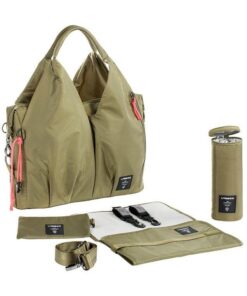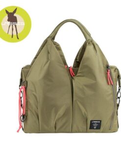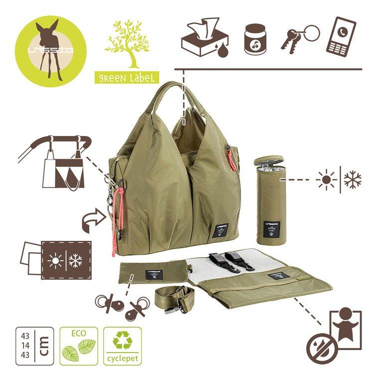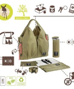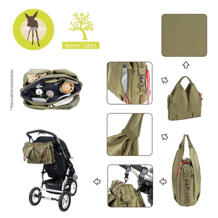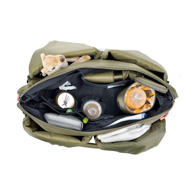 • wiele kieszeni wewnętrznych, w tym: duża, zapinana na zamek i wodoodporna, w której bezpiecznie ulokujesz poplamioną koszulkę czy śliniak i mniejsza na rzep – na ubranko na zmianę lub ukochany kocyk; dwie mniejsze przegródki wykończone gumką – doskonałe na słoiki z deserem lub obiadem – dodatkowo usztywnione i wyjmowane, bo przypięte do wewnątrz na zatrzaski; otwarta kieszonka na dołączoną do torby, poręczną, składaną matę do przewijania, w kolorze torby; oraz kieszeń z „okienkiem”, idealna na wilgotne chusteczki, bo umożliwia wyjmowanie ich bez wyciągania całego opakowania;