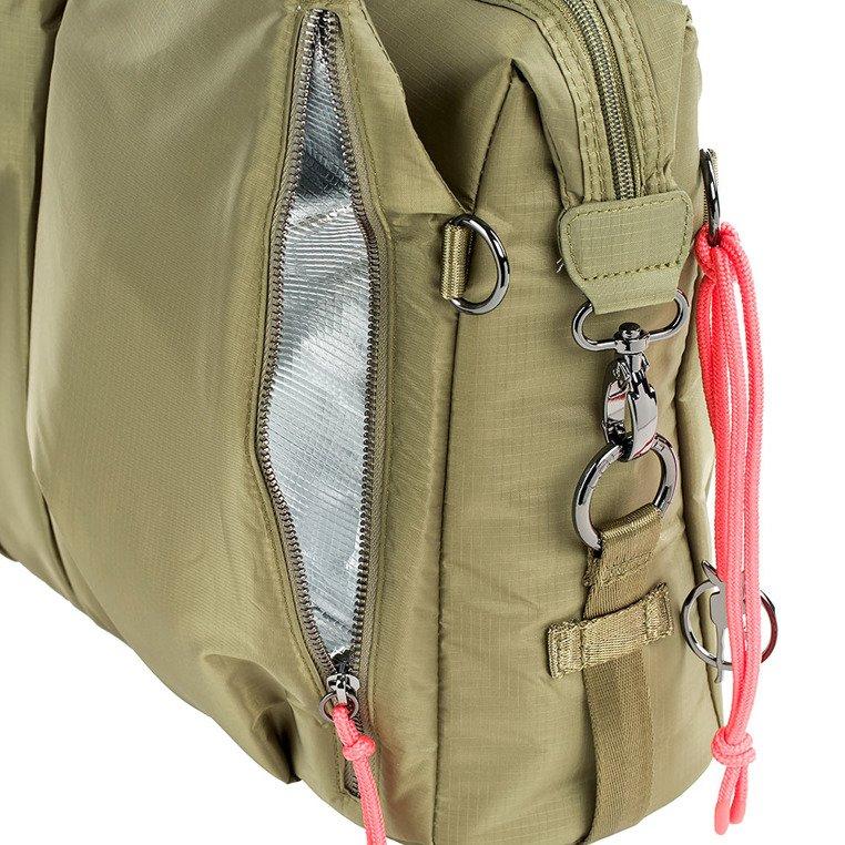 • pozostałe 2 kieszenie zewnętrzne zapinane są na suwak – jedna z nich sprawdzi się świetnie jako miejsce np. na pieluchy, druga z termoizolacją – przeznaczona jest np. na ciepły posiłek czy termofor;