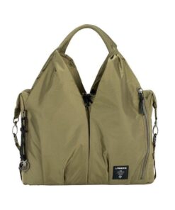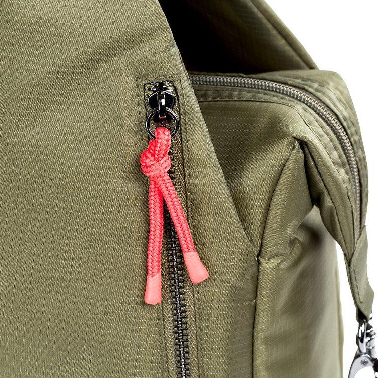 • wiele kieszeni zewnętrznych, w tym: 4 jakby ukryte pomiędzy kieszenią główną a ramionami torby, w jednej z nich znajdziesz przypięty na zatrzask brelok na klucze, w innej – mniejszą przegrodę, która zapina się na rzep – w sam raz na telefon;