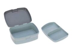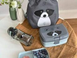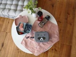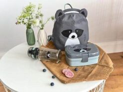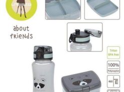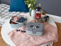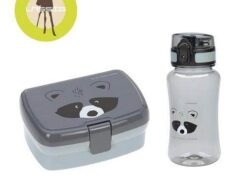 Piękny zestaw lunchowy niemieckiej marki LASSIG składa się z pojemnego lunchbox’a i butelki – bidonu. Przyda się do przedszkola lub szkoły, podczas spacerów, treningów i wycieczek. Pudełko jest sprytnie podzielone na część główną na dole, która pomieści np. kanapki oraz wyjmowany dwudzielny pojemnik na przekąski, np. pokrojone owoce czy wafelki, który można umieścić w górnej przestrzeni. Box można wygodnie zamknąć i otworzyć za pomocą szerokiego klipsa, który nie otworzy się samoistnie. Transparentna, jasnoszara butelka ma pojemność 460 ml i wykonana jest z Tritanu™ – nowoczesnego tworzywa BPA free. Nakrętka z wygodnym sportowym ustnikiem ma zintegrowaną przeźroczystą osłonę, zamykaną na klik, która zapobiega przypadkowemu rozlaniu się napoju oraz gwarantuje zachowanie higieny oraz antypoślizgowy silikonowy pas pośrodku, ułatwiający jej odkręcanie. Pojemniki są lekkie, solidne i szczelne. Mają ergonomiczny kształt i zmieszczą się nawet do małego plecaka czy torby. Jasno turkusowy lunchbox ma popielatą pokrywkę z grafiką słodkiego szopa. Ta sama mordka znajduje się także na bidonie.