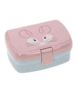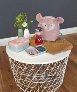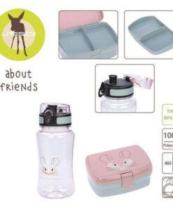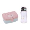 Piękny zestaw lunchowy niemieckiej marki LASSIG składa się z pojemnego lunchbox’a i butelki – bidonu. Przyda się do przedszkola lub szkoły, podczas spacerów, treningów i wycieczek. Pudełko jest sprytnie podzielone na część główną na dole, która pomieści np. kanapki oraz wyjmowany dwudzielny pojemnik na przekąski, np. pokrojone owoce czy wafelki, który można umieścić w górnej przestrzeni. Box można wygodnie zamknąć i otworzyć za pomocą szerokiego klipsa, który nie otworzy się samoistnie. Transparentna, jasnoróżowa butelka ma pojemność 460 ml i wykonana jest z Tritanu™ – nowoczesnego tworzywa BPA free. Nakrętka z wygodnym sportowym ustnikiem ma zintegrowaną przeźroczystą osłonę, zamykaną na klik, która zapobiega przypadkowemu rozlaniu się napoju oraz gwarantuje zachowanie higieny oraz antypoślizgowy silikonowy pas pośrodku, ułatwiający jej odkręcanie. Pojemniki są lekkie, solidne i szczelne. Mają ergonomiczny kształt i zmieszczą się nawet do małego plecaka czy torby. Jasnoturkusowy lunchbox ma różową pokrywkę z grafiką pogodnej szynszyli. Ta sama mordka znajduje się także na bidonie.