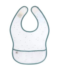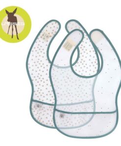 Zestaw dwóch praktycznych, łatwo zmywalnych śliniaków niemieckiej marki LASSIG. Są duże, transparentne, wykonane z wodoodpornego tworzywa – jeden w turkusowo-złote kropeczki, drugi w gęsty wzór ze złotych kropeczek, oba z obszyciem w matowym odcieniu turkusu. Miękka taśma i zapięcie na rzep zapewniają komfort użytkowania. Śliniaki przeznaczone są dla dzieci od 6. do 24. miesiąca życia. Sprawdzą się przy płynnych czy szczególnie brudzących posiłkach, przy karmieniu, jak i pierwszych próbach samodzielnego jedzenia. Na dole mają kieszonkę, gdzie mogą się zbierać resztki pokarmu, które nie trafiły do buzi. Dzięki temu masz pewność, że nie zaplamią ubrania maluszka.