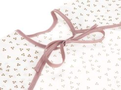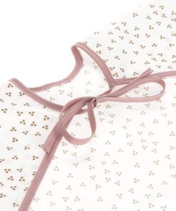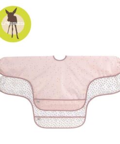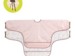 Zestaw dwóch praktycznych, łatwo zmywalnych śliniaków niemieckiej marki LASSIG. Są duże, wykonane z wodoodpornego tworzywa – jeden jasnoróżowy w złote kropeczki, drugi transparentny w gęsty wzór ze złotych kropeczek, oba z obszyciem w matowym odcieniu różu. Mają długie rękawy, miękką taśmę i wiązanie na tasiemki, a na dole funkcjonalną kieszonkę. Przeznaczone są dla dzieci od 6. do 24. miesiąca życia. Sprawdzą się nie tylko podczas karmienia malucha, ale też przy każdej twórczej aktywności dziecka: malowaniu, lepieniu z gliny, zabaw plasteliną czy prób samodzielnego przygotowania posiłku. Wygodne, nie krępują ruchów, dobrze przylegają do ubrań.
