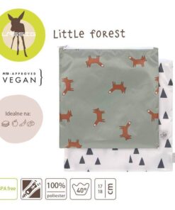 Kolekcja Little Forest powstała z miłości do natury. Wykorzystuje odnawialne tworzywa i bawełną organiczną – materiały ekologiczne i idealne również dla alergików. Serię zdobią postacie zajączka i liska oraz stonowane graficzne i leśne motywy. Wszystkie produkty – od kompletów naczyń i śliniaków po wyjątkowo miękkie otulacze i kocyki dostępne są w dwóch wersjach kolorystycznych: jasnym różu i pastelowym odcieni oliwki.