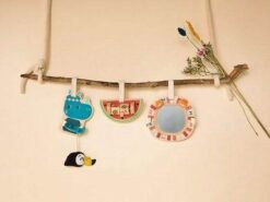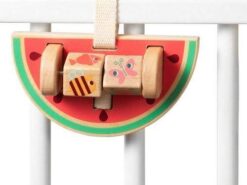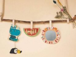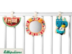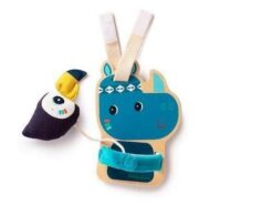 Zestaw 3 zawieszek aktywizujących z kolekcji Nosorożec Marius belgijskiej marki Lilliputiens to niebanalne zabawki z naturalnego drewna, angażujące dziecko na wiele godzin. W skład zestawu wchodzą: drewniany nosorożec Marius z długimi łapkami, w których trzyma pluszowego, szeleszczącego tukana Pabla, drewniany plaster arbuza z metalowym drążkiem z 2 klockami do obracania i grafikami zwierzątek na nich, a także lusterko w drewnianej ramie z grafiką lwiej grzywy i odstającymi uszami lwa Jacka. Zawieszki posiadają rzepy do mocowania, np. do pałąka w wózku, nosidełku, foteliku samochodowym, macie czy do barierki łóżeczka. Zabawka jest solidnie wykonana i w pełni bezpieczna. Rozwija koordynację ręka-oko, małą motorykę (chwytanie, potrząsanie, obracanie, ugniatanie), aktywizuje zmysł słuchu (szeleści), wzroku (lusterko) i dotyku.