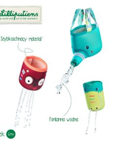 Kubeczki zdobią buźki charakterystycznych dla marki zwierzątek – Słonia Alberta, Lemura Georga i Krokodyla Anatola. Mają zaokrąglone kształty, są lekkie, miękkie i unoszą się na wodzie. Każdy z nich posiada otwór, bądź otwory, przez które można przelewać wodę, tworząc np. deszczową fontannę lub konewkę.