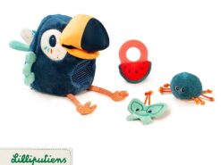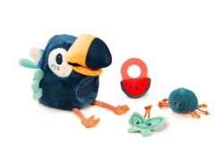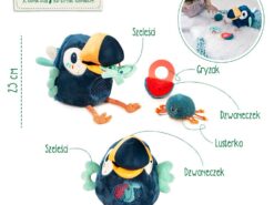 W jego imponującym dziobie ukryty jest dzwoneczek, a skrzydła i kuperek – szeleszczą. W zestawie znajdują się także trzy mniejsze pluszowe zabawki – szeleszczący motylek, puchaty pająk z bezpiecznym lusterkiem na brzuszku i plasterek arbuza, który ma wszyty delikatny dzwoneczek i okrągły silikonowy gryzak. Można nimi „nakarmić” tukana, wkładając je do jego dzioba, skąd wpadają do jego okrągłego dużego brzuszka – są tam widoczne, dzięki wszytej siateczce.