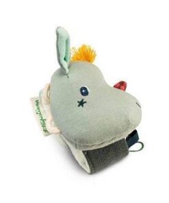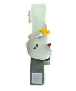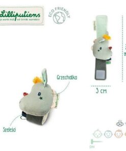 Pluszowa grzechotka na zwijanej bransoletce Smok Joe belgijskiej marki Lilliputiens to niebanalna aktywizująca zabawka dla niemowląt. Miękka, kolorowa, uszyta z bawełny, bransoletka jest zapinana na rzep i można ją założyć na rączkę lub nóżkę maluszka. Szeleści przy pocieraniu. Zdobi ją główka – grzechotka zielonego Smoka Joe ze stymulującymi sensorycznie uszami, sznurkowymi wypustkami, tasiemkami, fryzurą i rogiem na nosie. Zabawka rozwija małą motorykę (potrząsanie), aktywizuje zmysł słuchu (szeleści, grzechocze), wzroku i dotyku. Grzechotka wykonana została z jersey’u i elanobawełny organicznej oraz wypełniona poliestrem z recyklingu.