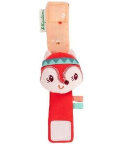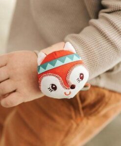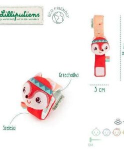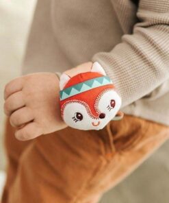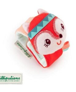 Pluszowa grzechotka na zwijanej bransoletce Lisiczka Alice belgijskiej marki Lilliputiens to niebanalna aktywizująca zabawka dla niemowląt. Miękka, kolorowa, uszyta z bawełny, bransoletka jest zapinana na rzep i można ją założyć na rączkę lub nóżkę maluszka. Szeleści przy pocieraniu. Zdobi ją główka – grzechotka uroczej rudej Lisiczki Alice ze stymulującymi sensorycznie uszkami i tasiemkami. Zabawka rozwija małą motorykę (potrząsanie), aktywizuje zmysł słuchu (szeleści, grzechocze), wzroku i dotyku.