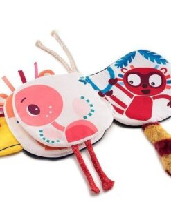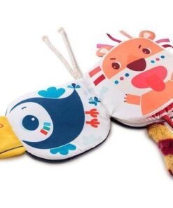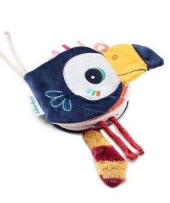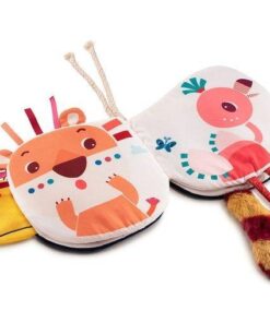 Książeczka aktywizująca „Kto się kryje za Pablo?” belgijskiej marki Lilliputiens to idealna pierwsza lektura dla maluszka. Na jej okładce znajduje się Tukan Pablo z – wystającym poza strony książeczki – wielkim dziobem. Na kolejnych stronach lektury ukryły się inne zwierzęta – mieszkańcy dżungli, bohaterowie marki Lilliputiens, których można spróbować rozpoznać po elementach o różnym kształcie i fakturze, wystających poza powierzchnię stron. I tak: tasiemkowa grzywa i uszka zdradzają Lwa Jacka, długie sznurkowe nogi wskazują na Flaminga Anais, a puszysty ogon w paski – Lemura Georga. Każda z postaci ma swoją „kartkę”, czyli aż dwie strony, w książeczce. Zabawkę można zawiesić przy wózku lub szczebelkach łóżeczka, dzięki dodatkowym sznureczkom. Książeczka jest mięciutka, perfekcyjnie wykończona, z dbałością o każdy szczegół i w pełni bezpieczna dla dziecka. Pobudza dziecięcą wyobraźnię i ciekawość, aktywizuje zmysły wzroku, dotyku i sferę uczuciową. Jest także świetnym sposobem na zaszczepienie w maluszku miłości do książek.