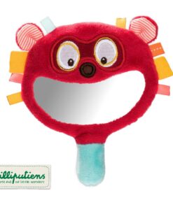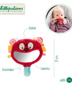 Bezpieczne i giętkie lusterko stanowi szeroki uśmiech charakterystycznego dla marki zwierzątka – bordowego Lemura Georga. Zabawka jest równocześnie grzechotką. Ma uszka i krótkie włosy z barwnych tasiemek i wydaje szeleszczący dźwięk przy pocieraniu. Pluszowy uchwyt jest łatwy do utrzymania w małych rączkach.