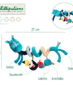 Ma postać ślicznego radosnego niebieskiego nosorożca w formie długiej spirali, którą można owinąć wokół pałąka wózka, nosidełka, fotelika samochodowego czy barierki łóżeczka. Znajdują się na niej kolejno: