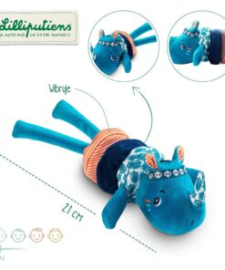 Miękka przytulanka ma postać uroczej leżącego Nosorożca Mariusa, której tułów po naciągnięciu wibruje. Przy pomocy długich nóżek zabawkę można zawiesić na pałąku wózka lub fotelika samochodowego. Zabawka rozwija małą motorykę (potrząsanie, pociąganie), wzroku i dotyku (wibracje, różnorodne tkaniny).