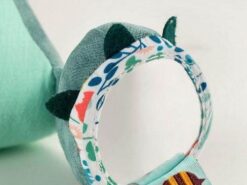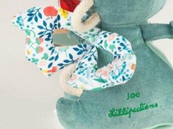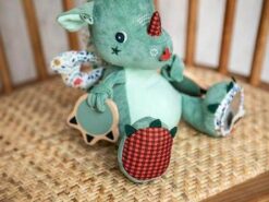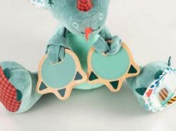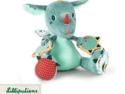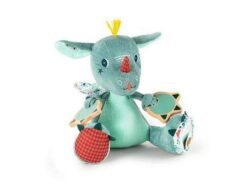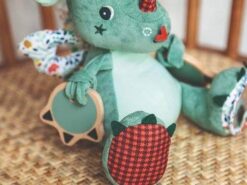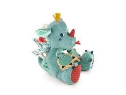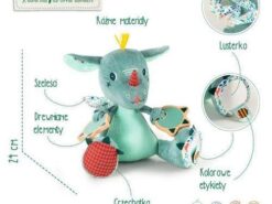 Przytulanka aktywizująca z kolekcji Smok Joe belgijskiej marki Lilliputiens to niebanalne, miękkie i wielofunkcyjne źródło rozrywki i nauki dla ciekawskich maluszków. Ma postać zielonego smoka o imieniu Joe ze skrzydłami i czerwonym rogiem na nosie. Smok ma spore odstające uszy, trochę nitkowych włosów, malutki tekstylny ogień „buchający” z pyszczka i drewniane łapki, którymi można klaskać (lub używać ich jako gryzaków). Dwa skrzydła stanowią poręczne dla małych rączek uchwyty, a wypustki na plecach to stymulujące sensorycznie pętelki ze sznurka. Pod jedną z nóg Joe ma giętkie bezpieczne lusterko, a w drugiej – grzechotkę. Zabawka jest solidnie wykonana i w pełni bezpieczna. Zaskakuje i pobudza dziecięcą wyobraźnię. Rozwija małą motorykę (chwytanie, potrząsanie, pociąganie, ugniatanie), aktywizuje zmysł słuchu (szeleści, grzechocze, stuka), wzroku (lusterko) i dotyku (różne wypustki i tkaniny), a dzięki gryzakom – przynosi ulgę w trudnym okresie ząbkowania.