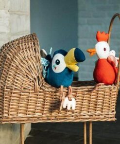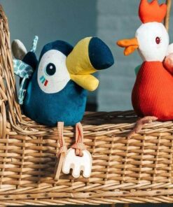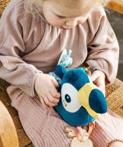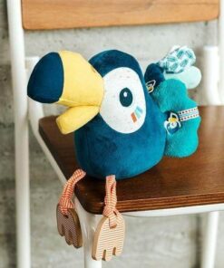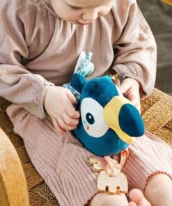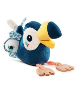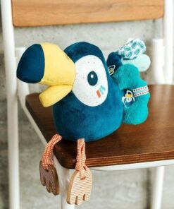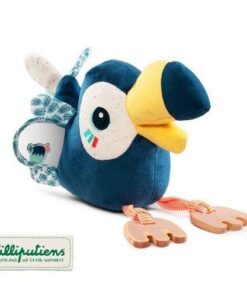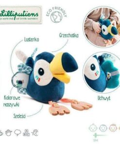 Przytulanka aktywizująca z kolekcji Tukan Pablo belgijskiej marki Lilliputiens to niebanalne, miękkie i wielofunkcyjne źródło rozrywki i nauki dla ciekawskich maluszków. Ma postać tukana o imieniu Pablo z imponującym dziobem. Ptaszysko ma odstające kolorowe pióra i ogon – idealne do łapania przez małe rączki, oraz kilka małych naszywek, jedno skrzydło w postaci uchwytu, a drugie – z giętkim bezpiecznym lusterkiem. Głowa tukana grzechocze, a niektóre piórka w kuperku – szeleszczą. Zabawka ma także nogi – długie tasiemki, zakończone drewnianymi stopami, które klapią w kontakcie z podłożem oraz mogą z powodzeniem pełnić rolę gryzaków. Zabawka jest solidnie wykonana i w pełni bezpieczna. Zaskakuje i pobudza dziecięcą wyobraźnię. Rozwija małą motorykę (chwytanie, potrząsanie), aktywizuje zmysł słuchu (szeleści, grzechocze, stuka), wzroku (lusterko) i dotyku (różne wypustki i tkaniny), a dzięki gryzakom – przynosi ulgę w trudnym okresie ząbkowania.