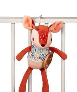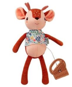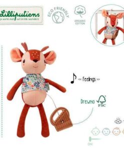 Przytulanka z pozytywką Sarenka Stella belgijskiej marki Lilliputiens to wspaniały pierwszy przyjaciel maluszka. Jest idealny do tulenia, uspokajania i usypiania. Ma postać brązowej sarenki o imieniu Stella, aż 32 cm wysokości i drewnianą fletnię, która stanowi jednocześnie uchwyt ukrytej wewnątrz pozytywki. Pociągniecie za instrument, uaktywnia znaną, przyjemną dla ucha melodię utworu „Feelings” , śpiewanego m. in. przez Morrisa Alberta. Muzykująca Stella nosi top w droby botaniczny wzór, ma spore, odstające uszy i pasiaste różki. Zabawka jest solidnie wykonana i bezpieczna. Wyposażona w troczki, które umożliwiają powieszenie jej przy łóżeczku czy wózku dziecka. Zaskakuje i pobudza dziecięcą wyobraźnię. Aktywizuje zmysł słuchu, pomaga w zasypianiu i wyciszaniu się.