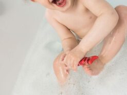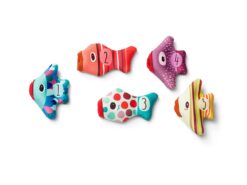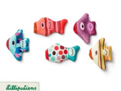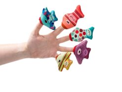 Otwarty pyszczek rybki jest jednocześnie otworem na palec malucha. Na ich bokach znajdują się ponadto numerki – od 1 do 5, dzięki którym dziecko może trenować naukę liczenia i rozpoznawania cyfr.