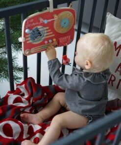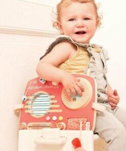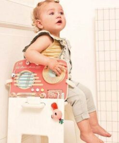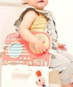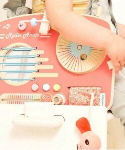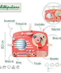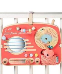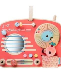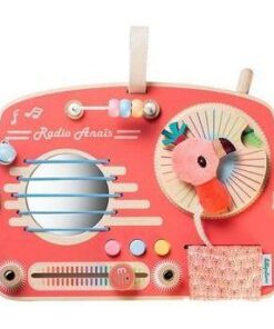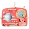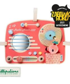 Drewniana tablica manipulacyjna w kształcie radia z kolekcji Flaming Anais belgijskiej marki Lilliputiens to niebanalne wielofunkcyjne źródło rozrywki i nauki dla ciekawskich maluszków. Zabawka posiada wiele funkcji: metalowy drążek z 3 koralikami do przesuwania, elastyczną antenkę, dzwoneczek, bezpieczne lusterko, na którym znajduje się 5 gumowych strun do potrącania lub naciągania, 3 guziczki do wciskania, 2 obracane klocki, tor z ruchomą pszczółką do przesuwania, spory obracany element, pod którym ukryte są postacie z kolekcji Dżungla oraz Flaminga Anais – miękką grzechotkę na sznurku, którą można umieścić w specjalnej kieszonce. Tablica ma kształt radia w stylu retro i piękny różowy kolor. Posiada 3 zapięcia na rzepy (po bokach i u góry), umożliwiające zamocowanie jej np. do ramy łóżeczka. Zabawka jest solidnie wykonana i w pełni bezpieczna. Pomalowana jest bezpiecznymi farbami na bazie wody. Zaskakuje i pobudza dziecięcą wyobraźnię. Rozwija koordynację ręka-oko, małą motorykę (chwytanie, potrząsanie, wkładanie, wyjmowanie, przesuwanie, obracanie, naciskanie, naciąganie), aktywizuje zmysł słuchu (dzwonienie, grzechotanie) i wzroku (lusterko).