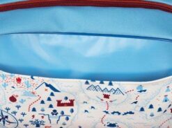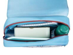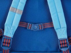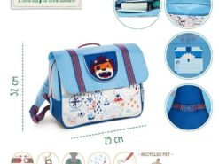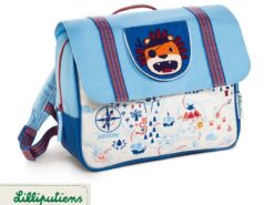 Uroczy i poręczny tornister z kolekcji Lew Jack belgijskiej marki Lilliputiens. Funkcjonalny, lekki i wygodny, idealny do przedszkola czy pierwszej klasy szkoły, pomieści zeszyty czy książki formatu A4. Szeroka biało-niebieska w motyw mapy skarbów komora główna jest zapinana na kontrastowy brązowo-bordowy suwak oraz przykrywana sporą klapą na rzep, która okrywa również mniejszą kieszeń zewnętrzną. Na klapie naszyta jest małą klapka z haftowanym pyszczkiem Lwa Jacka w pirackiej przepasce na oku. Pod spodem klapki znajduje się wizytówka, na której można zapisać imię dziecka i numer kontaktowy rodzica. Tornister posiada dość szerokie, u góry miękkie i grubsze, szelki z regulacją długości. Z przodu na klatce piersiowej ma dodatkowy pasek stabilizujący i odciążający plecy, zapinany na łatwy w obsłudze zatrzask. W górnej części znajduje się uchwyt do zawieszenia, np. na haczyku w szatni. Paski są dwukolorowe: pomarańczowo-ciemnoniebieskie, a zatrzask i blokady regulacji – ciemnoniebieskie. Zarówno z przodu tornistra, jak i na szelkach, znajdują się elementy odblaskowe. Tornister uszyto z wysokiej jakości materiałów, miękkich, łatwych do czyszczenia i odpornych na wilgoć. Jest perfekcyjnie wykończony, z dbałością o każdy szczegół i w pełni bezpieczny dla dziecka.