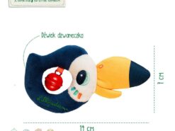 Miękka zabawka ma kształt Tukana Pablo z dorodnym dziobem, a w otworze do chwytania zamocowany uroczy, czerwony dzwoneczek, który potrząsany wydaje przyjemny dla ucha dźwięk.