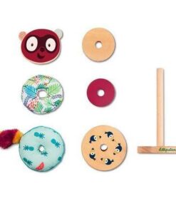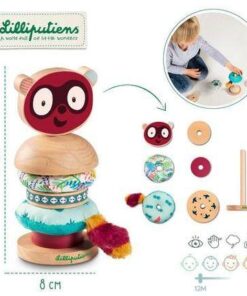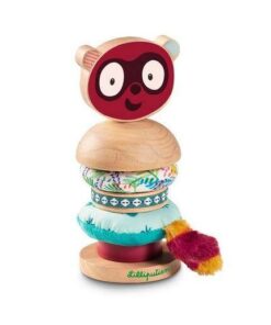 Drewniana układanka piramida z miękkimi elementami Lemur George belgijskiej marki Lilliputiens to niebanalne źródło rozrywki i nauki dla ciekawskich maluszków. Zabawka została pomalowana bezpiecznymi farbami na bazie wody i wzbogacona o kilka miękkich elementów z materiałów o różnych wzorach i fakturach. Na drewnianej podstawce znajduje się drążek, na którym należy umieszczać okrągłe klocki z dziurką, by stworzyć 6-częściową postać Lemura George’a. 1 drewniany klocek ma kształt półkuli, 2 – niskich walców, 2 miękkie, wykonane z tkanin, przypominają donuty (jeden z nich ma puchaty lemurzy ogon), a ostatni to drewniana główka lemura. Układanie piramidy wspiera rozwój wielu kluczowych umiejętności, m.in. chwytu i koncentracji. Zabawka jest solidnie wykonana i w pełni bezpieczna. Zaskakuje i pobudza dziecięcą wyobraźnię. Rozwija koordynację ręka-oko oraz małą motorykę (chwytanie, celowanie, wkładanie, zdejmowanie).