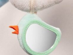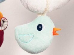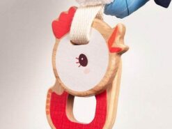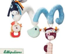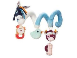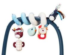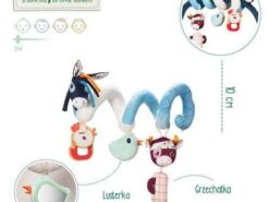 Wielofunkcyjna spirala do wózka z kolekcji Farma belgijskiej marki Lilliputiens to idealna zabawka dla niemowląt. Ma postać biało-niebiesko-granatowego osiołka Ignace’a w formie długiej spirali, którą można owinąć wokół pałąka wózka, nosidełka, fotelika samochodowego czy barierki łóżeczka. Znajdują się na niej kolejno: dwuczęściowa drewniana Kokoszka Paulette z uchwytem, której elementami można stukać, ptaszek z bezpiecznym, giętkim lusterkiem oraz Krówka Rosalie ze sznurkową szyją i tułowiem w kształcie walca, wewnątrz którego znajduje się dzwoneczek. Głowa Ignace’a ma dłuższe uszka i stymulującą sensorycznie grzywę z różnokolorowych sznurków. Zabawka jest solidnie wykonana i w pełni bezpieczna dla maluszków. Rozwija małą motorykę (chwytanie, potrząsanie, obracanie, pociąganie, bujanie), aktywizuje zmysł słuchu (dzwoni, stuka), wzroku (lusterko) i dotyku.