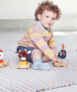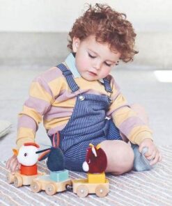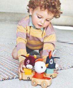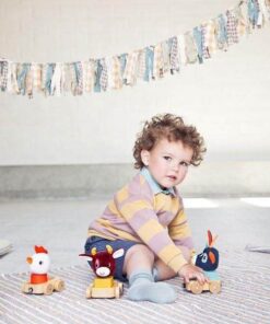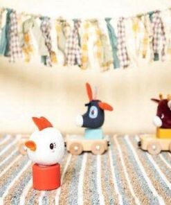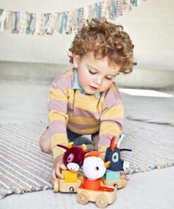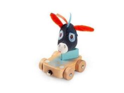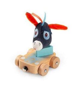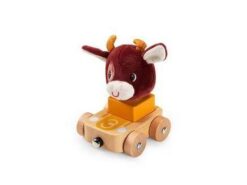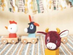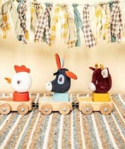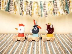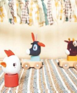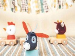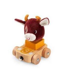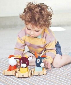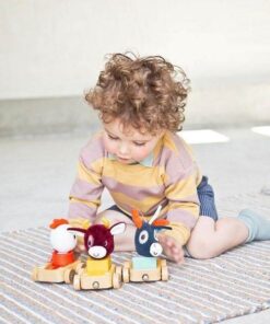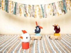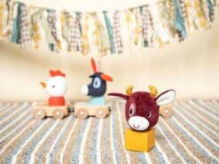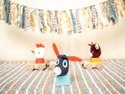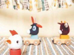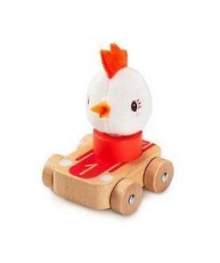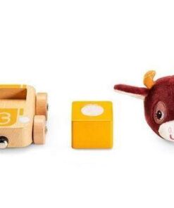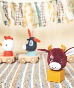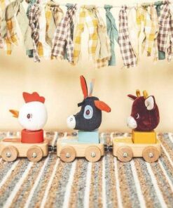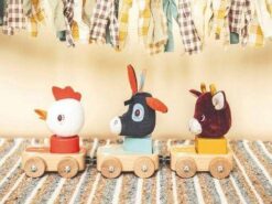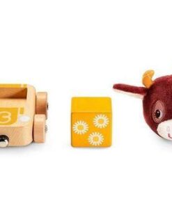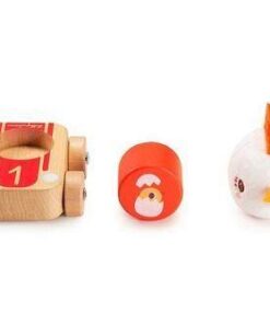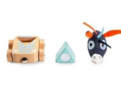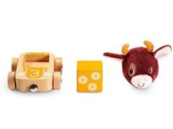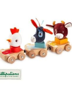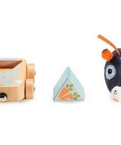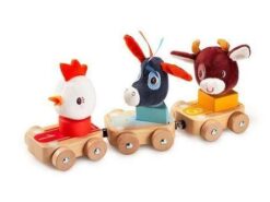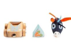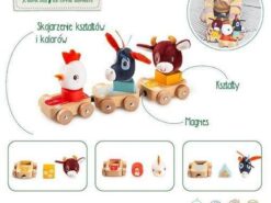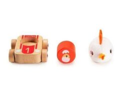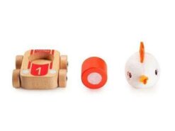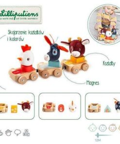 Zestaw 3 pojazdów z kolekcji Farma belgijskiej marki Lilliputiens to niebanalna zabawka z naturalnego drewna, angażująca dziecko na wiele godzin. W skład zestawu wchodzą 3 platformy na kółkach z grafiką z cyframi od 1 do 3, przypominającą wyścigowe samochody i wgłębieniami na pozostałe elementy: drewniane klocki-kabiny w odpowiadających tym wgłębieniom kształtach – koło, trójkąt, kwadrat (funkcja sortera) – oraz mocowane do nich na rzep pluszowe główki zwierzaków-kierowców: kokoszki Paulette, osiołka Ignage’a oraz krówki Rosalie. Pojazdy łączą się ze sobą za pomocą magnesów. Wszystkie elementy zestawu mają poręczne dla maluszka rozmiary. Zabawka jest solidnie wykonana i bezpieczna. Pobudza dziecięcą wyobraźnię, zachęca do snucia opowieści, odgrywania ról i odtwarzania takich sytuacji, jak np. wyścigi czy karmienie zwierząt gospodarskich (na spodzie kloców znajdują się grafiki z marchewkami, stokrotkami i kurczaczkiem w skorupce). Rozwija koordynację ręka-oko, małą motorykę (chwytanie, suwanie, wkładanie, wyjmowanie, łączenie na magnes i na rzep), aktywizuje zmysł wzroku i dotyku, uczy liczenia do 3, rozpoznawania kształtów i kolorów.