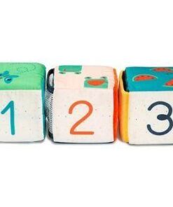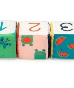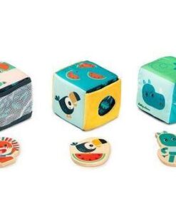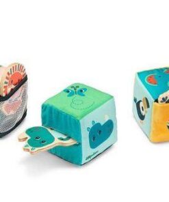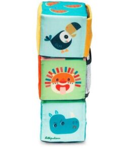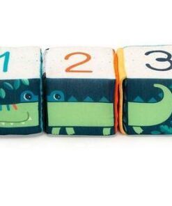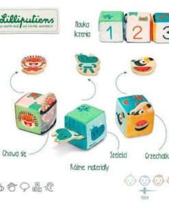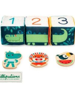 Zestaw 3 kostek aktywizujących z kolekcji Dżungla belgijskiej marki Lilliputiens to niebanalne, miękkie i wielofunkcyjne źródło rozrywki i nauki dla ciekawskich maluszków. Na każdym z boków każdej kostki znajduje się inne wyzwanie, m. in.: cyfry od 1 do 3, które trzeba posegregować w odpowiedniej kolejności, postać Krokodyla Anatola do ułożenia jak puzzle czy kieszonki lub schowki, w których należy ukryć dołączone do zestawu drewniane figurki – lwa Jacka, tukana Pablo oraz nosorożca Mariusa – odpowiednio na kostce z ich podobizną. Kostki zostały uszyte z materiałów o różnych wzorach i fakturach, są solidnie wykonane i w pełni bezpieczne. Zaskakują i pobudzają dziecięcą wyobraźnię. Rozwijają koordynację ręka-oko i małą motorykę (chwytanie, ciągnięcie, wkładanie, wyciąganie), aktywizują zmysł słuchu (jedna z kostek grzechocze, inna szaleści), wzroku i dotyku, uczą liczenia do 3, a poprzez zabawę w chowanie – dostrzegania związków przyczynowo-skutkowych.