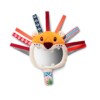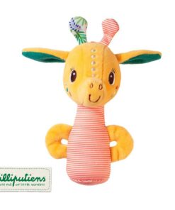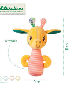 Miękka zabawka ma postać słodkiej żółtej kształt Żyrafki Zii w pasiastym ubranku. Potrząsana grzechocze, a jej zaokrąglone łapki, wystające uszy i różki dodatkowo stymulują sensorycznie i zachęcają do trenowania umiejętności chwytu.