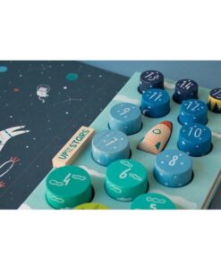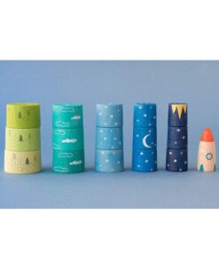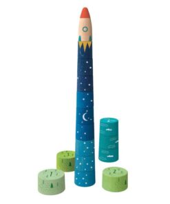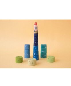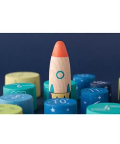 Układając tę rakietę maluch może w swojej wyobraźni wystartować do gwiazd! Należy rozpocząć od podstaw – trzech zielonych krążków. Na każdym jest cyferka, która ułatwi właściwe układanie. Następne w kolejności są trzy krążki, dzięki którym rakieta zacznie sięgać chmur. Te krążki mają cyferki od 4 do 6. Kolejne krążki to cyferki 7-9, którymi rakieta zaczyna sięgać gwiazd. Do księżyca pomogą się dostać krążki z cyferkami 10-12. Kosmosu sięgną krążki 13-15. Zwieńczeniem budowli jest kokpit rakiety.