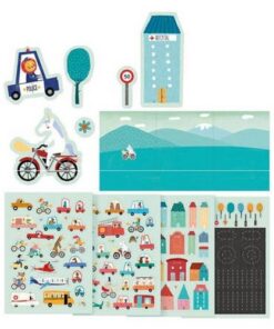 Zestaw 150 usuwalnych naklejek pojazdów transportowych z różnymi postaciami, domami, roślinami i drzewami, drogami i znakami drogowymi, dzięki którym dziecko miasto swoich marzeń na wybranej przez siebie scenie!