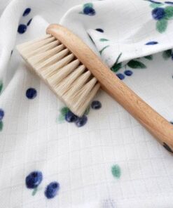 Bardzo miękka i delikatna szczotka dla dzieci i niemowląt z naturalnego włosia koziego z drewnianą rączką w zestawie z praktyczną muślinową myjką.