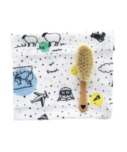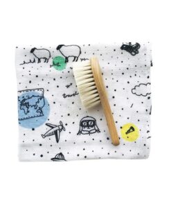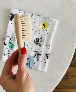 Bardzo miękka i delikatna szczotka dla dzieci i niemowląt z naturalnego włosia koziego z drewnianą rączką w zestawie z praktyczną muślinową myjką.