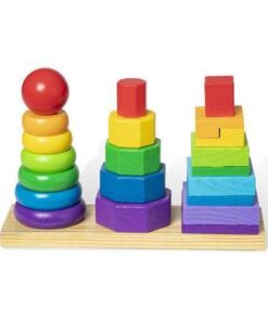 Nowa odsłona klasycznej piramidki do układania, jednak zamiast jednej, otrzymujemy w zestawie 3 różne wieże o odmiennych kształtach. Zestaw składa się z 21 drewnianych elementów geometrycznych, – kółek, kwadratów i wielościanów. Zabawka pomaga w nauce kształtów, kolorów, ćwiczy percepcję, logikę i zdolności manualne. Wyjątkowe w tym modelu jest to, że każda wieża posiada odmienny stopień trudności, dzięki czemu maluch szybko nie znudzi się zabawką.