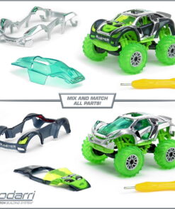 Zestaw Modarri Turbo Kosmiczni Intruzi, do złożenia z 12 części, samochód Modarri Turbo, w dwóch wersjach z bardzo dużymi kołami do jazdy w trudnym kosmicznym terenie – model Alien Blaster oraz model UFO Hunter. Cały zestaw składa się z 14 wymiennych części takich jak maska samochodu (dwie wersje), błotniki (dwie wersje), rama, duże gumowe opony, felgi. Do opakowania dołączony jest śrubokręt. Dzięki modułowemu systemowi Modarri możesz łączyć i dopasowywać dowolną ramę, maskę i błotnik do wszystkich modeli Modarri, także Turbo, dzięki czemu możesz zrobić tysiące nowych modeli. Po prostu poluzuj wbudowane śrubki za pomocą dołączonego do opakowania śrubokręta i wymień części, tworząc nowy model Modarri.