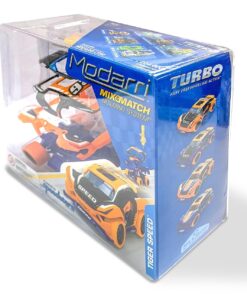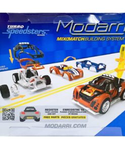 Zestaw Modarri Turbo Tygrys, do złożenia z 12 części, samochód Modarri Turbo, w czterech wyścigowych wersjach. Cały zestaw składa się z 14 wymiennych części takich jak maska samochodu (dwie wersje), błotniki (dwie wersje), rama, opony, felgi. Do opakowania dołączony jest śrubokręt. Dzięki modułowemu systemowi Modarri możesz łączyć i dopasowywać dowolną ramę, maskę i błotnik do wszystkich modeli Modarri, także Turbo, dzięki czemu możesz zrobić tysiące nowych modeli. Po prostu poluzuj wbudowane śrubki za pomocą dołączonego do opakowania śrubokręta i wymień części, tworząc nowy model Modarri.