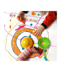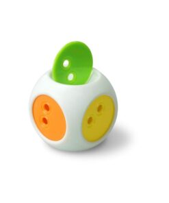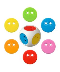 Kostka – dzięki jej kształtowi i temu, że jest elastyczna bardzo łatwo się turla czym sprawia wiele radości dzieciom. Żetony można łatwo wyjąć z kostki podważając je np. paznokciem, Twoje dziecko może potrzebować przy tym trochę pomocy, ale na pewno z radością będzie samodzielnie wkładać je z powrotem. Możesz stworzyć różnokolorowe kombinacje dla różnych gier, możesz również ukrywać małe skarby lub sekretne wiadomości w kostce, za żetonami. Na żetonach włożonych do kostki można również namalować liczby, buźki lub oczka.