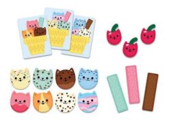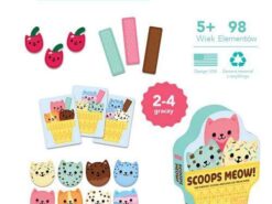 Gra Kocie kulki Miau! amerykańskiej marki MUDPUPPY składa się z 24 kart ze skomponowanymi deserami lodowymi, 32 kolorowych żetonów-kulek lodów w kształcie uroczych kocich pyszczków, 12 podłużnych żetonów-wafelków oraz 30 żetonów-wisienek (też z kocimi mordkami). Zadaniem graczy jest jak najszybsze odtworzenie z pamięci wylosowanych w swojej kolejce deserów. Za każdy dobrze wykonany deser gracz otrzymuje wisienkę. Wygrywa ten, który jako pierwszy zbierze ich 7. Taka gra to wspaniała zabawa zarówno dla dzieci, jak i dorosłych (może w niej brać udział od 2 do 4 osób). Uczy planowania, cierpliwości i skupienia, a przy okazji trenuje pamięć, szybkość reakcji i spostrzegawczość. Do gry dołączona jest instrukcja.