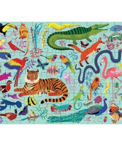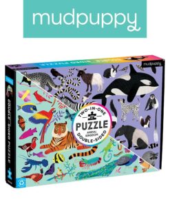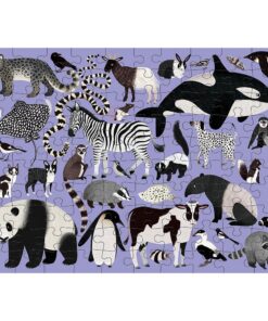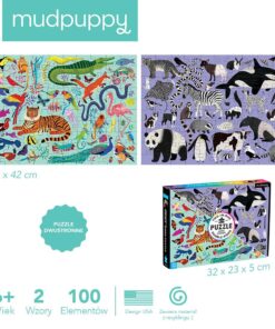 Następnym razem dziecko może zacząć układanie właśnie od niej. Jedna strona puzzli przedstawia wiele gatunków wielobarwnych dzikich zwierząt na niebieskim tle, druga – wyłącznie czarno-białe gatunki na tle fioletowym. Niebanalny design i piękne kolory dodatkowo zachęcają do zabawy. Taka układanka to również świetny sposób na pierwsze lekcje przyrody i poznanie ciekawych stworzeń.