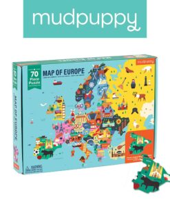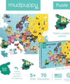 Zestaw puzzli edukacyjnych Mapa Europy amerykańskiej marki MUDPUPPY to 70 elementów, z których część ma kształt państwa, które przedstawia. Ułożenie całej mapy pomaga dziecku poznać wszystkie kraje Europy nie tylko z nazwy, ale też m.in. lokalizacji i kształtu granic. Profilowane elementy są ponadto dwustronne – po jednej stronie znajduje się angielska nazwa państwa i rzeczy, charakterystyczne dla danego regionu, np. budowle, flora czy fauna; na odwrocie zaś – nazwa tegoż kraju w językach: francuskim, hiszpańskim i niemieckim. Autorką projektu jest młoda artystka z Buenos Aires Sol Linero.