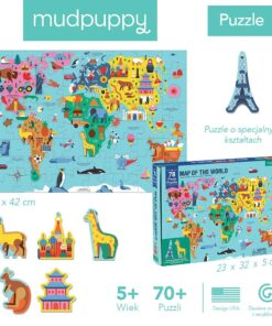 Zestaw puzzli edukacyjnych Mapa Świata amerykańskiej marki MUDPUPPY to 78 elementów, z których 17 ma kształt zwierząt, roślin, budynków czy innych, charakterystycznych dla danego kraju lub regionu, motywów. Ułożenie całej mapy – o wymiarach 59 x 42 cm – pomaga dziecku poznać wszystkie części świata – nie tylko z nazwy, ale też m.in. specyficznej dla danego regionu fauny lub flory, zwyczajów oraz zabytków. Autorką projektu jest młoda artystka z Buenos Aires Sol Linero.